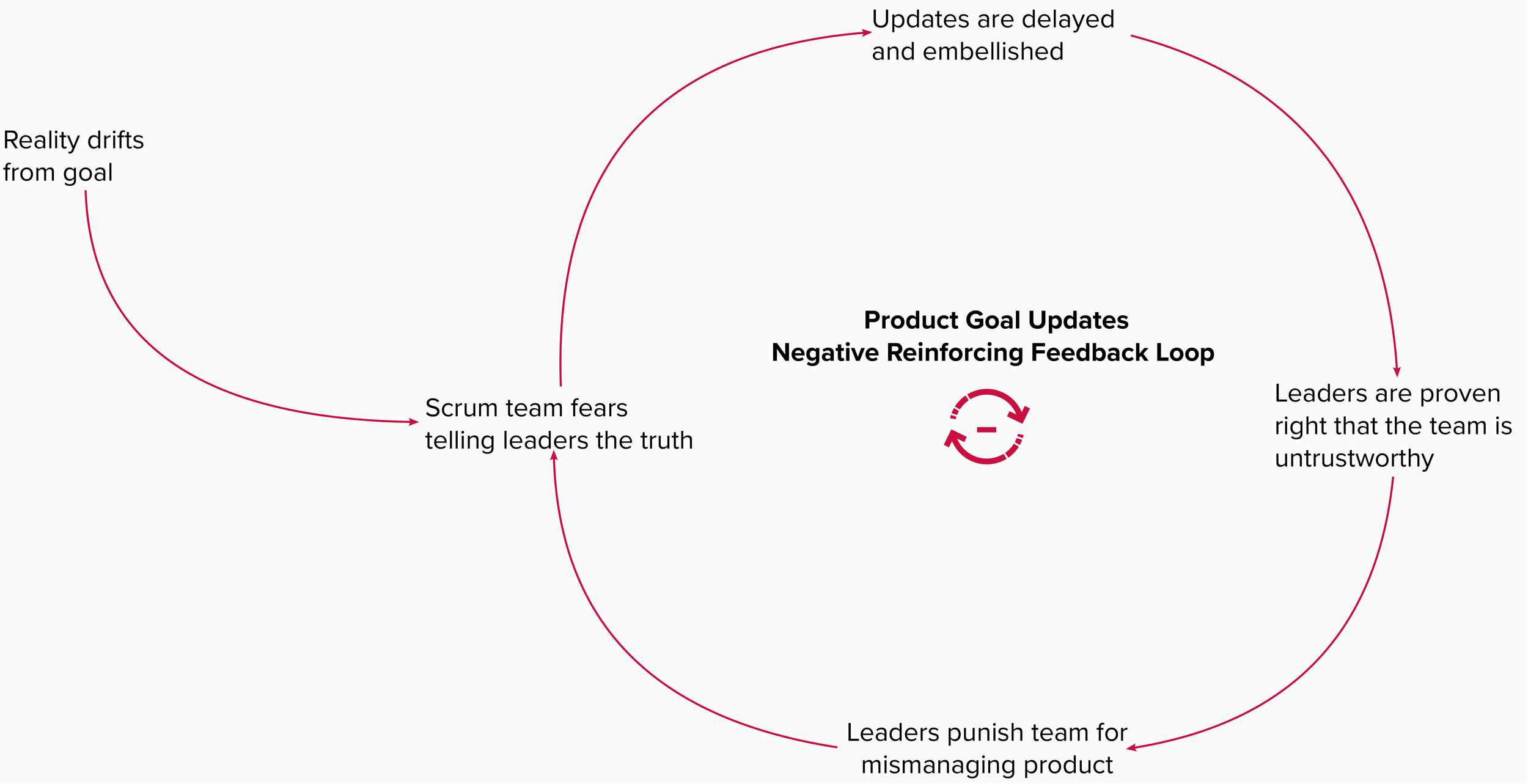 This is a self-fulfilling prophecy - by fearing to be truthful, a situation has emerged where communicating the truth can now lead to genuinely negative consequences. Eventually, the day this team planned to achieve their goal will come and the organization will learn the truth about their progress. The house of cards will come crumbling down. Leaders will punish this team for making them accomplices in the lie either explicitly on performance reviews or implicitly through falling out of favour and assigning them less important work. When this happens, the belief that telling the truth leads to negative consequences is reinforced so the team finds increasingly clever ways to communicate that their next goal is on track when, in reality, it is not. In systems thinking, this is called a negative reinforcing feedback loop and unfortunately, it's playing out in agile organizations everywhere.