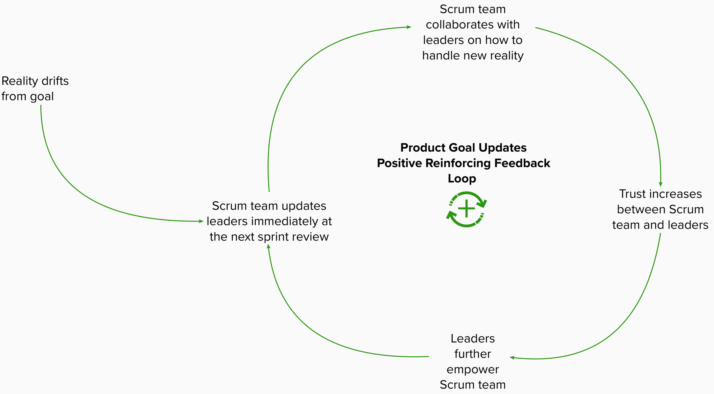 Of course leaders in the negative reinforcing feedback loop above would have difficulty empowering their Scrum team. Would you empower a team that rarely keeps you apprised of the information you need to do your job and when they do, the information you’re given is unreliable and politically slanted? That would simply be unwise leadership.